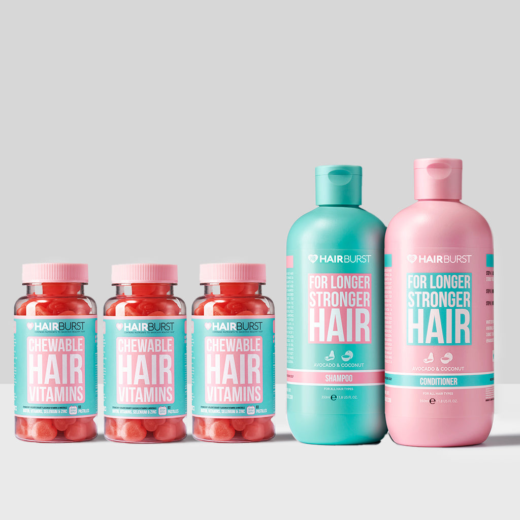 Zmagasz się z przerzedzaniem włosów, wolnym wzrostem lub łamliwością? Odmień swoje włosy w zaledwie 90 dni z Zestawem Startowym od Hairburst. Stworzony w wyniku ponad dekady badań, nasz Zestaw Startowy działa wraz z Twoim naturalnym cyklem włosów, gwarantując prawdziwe i widoczne rezultaty.